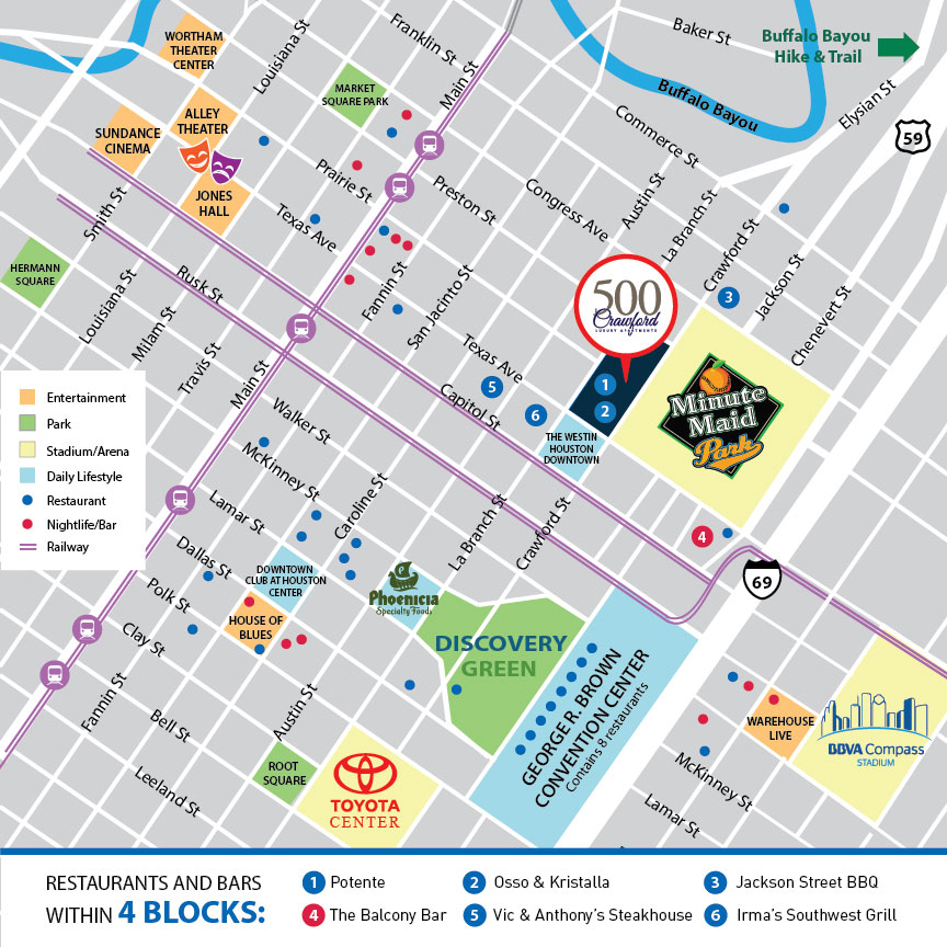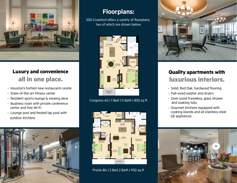 As the company’s only graphic designer and marketing manager, my responsibilities encompassed all print and digital materials. Below you’ll find an example brochure and map for 500 Crawford apartments in downtown Houston.